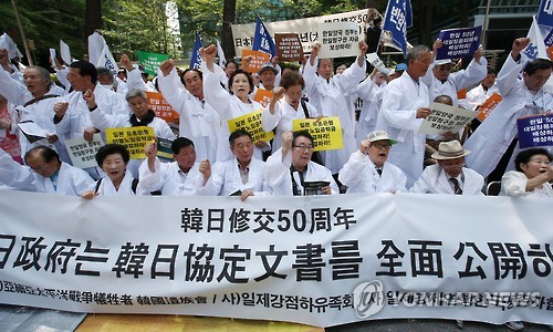 | △ 한일협정 보상내용 공개하라 (서울=연합뉴스) 한종찬 기자 = 한일수교 50주년을 맞은 22일 오전 서울 종로구 일본대사관 앞에서 아시아태평양전쟁희생자한국유족회 주최로 열린 한일협정 보상내용 공개촉구 기자회견에서 참가자들이 구호를 외치고 있다. |