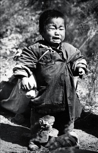 다섯 살도 채 안 돼 보이는 이 꼬마는 자기 몸보다 더 큰 봇짐을 진 채 울음을 터뜨리기 직전의 표정을 짓고 있다.