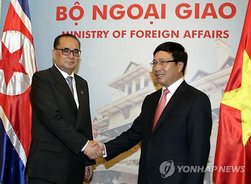 | △ 북한 리수용 외무상이 지난해 8월 베트남을 방문해 팜 빈 민 외교장관과 만나 악수를 하고 있다. 2015.6.23. |