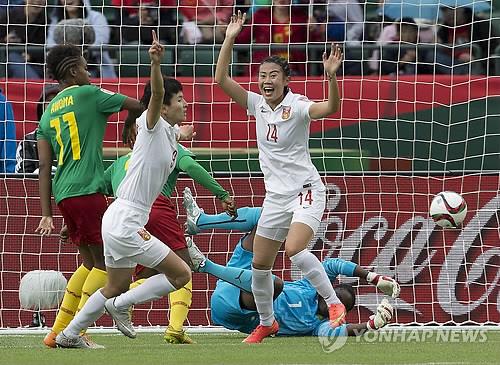 | △ 中, 카메룬 꺾고 여자월드컵 8강 진출 (에드몬톤 AP=연합뉴스) 중국이 20일(현지시간) 캐나다 에드몬톤의 코몬웰스 스타디움에서 열린 2015 국제축구연맹(FIFA) 여자월드컵에서 카메룬을 1-0으로 제압, 8강에 진출했다. 사진은 중국의 왕샨샨(9번)이 전반 12분 카메룬 골망을 가른 후 세리머니를 펼치고 있는 모습. marshal@yna.co.kr |