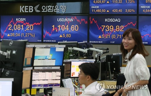 (서울=연합뉴스) 임수정 기자 = 코스피가 23일 그리스의 디폴트(채무 불이행) 우려가 완화된데 힘입어 2,080선 위로 껑충 뛰어올랐다.