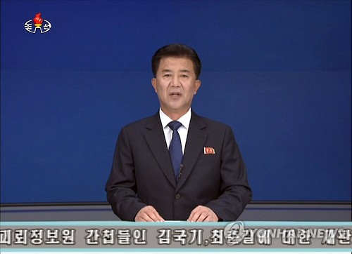 | △ 북한, 억류 중인 남한 국민 2명에 '무기징역' 선고 (서울=연합뉴스) 북한은 23일 억류 중인 남한 국민 김국기씨와 최춘길씨에게 무기징역형을 선고했다. 조선중앙통신은 이날 "최고재판소에서 미국과 남조선 괴뢰 패당의 조종 밑에 반공화국 정탐모략행위를 감행하다가 적발 체포된 괴뢰 정보원 간첩들인 김국기, 최춘길에 대한 재판이 열렸다"며 이들에게 "무기노동교화형이 언도됐다"고 전했다. 사진은 조선중앙TV가 이들의 재판 결과를 전하는 모습. |