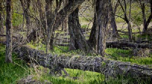 작품에선 나무가 우거져 있거나 작은 가지가 부러져 땅에 헝클어져 있는 모습이 보인다.
