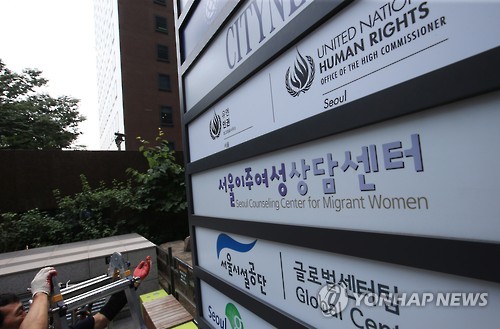 | △ 간판 내거는 유엔 북한인권사무소 (서울=연합뉴스) 홍해인 기자 = 23일 오전 서울 종로구 서린동 서울글로벌센터 입구에 이날 개소하는 '유엔 북한인권사무소'(서울 유엔인권사무소) 간판이 설치되고 있다. 2015.6.23 hihong@yna.co.kr |