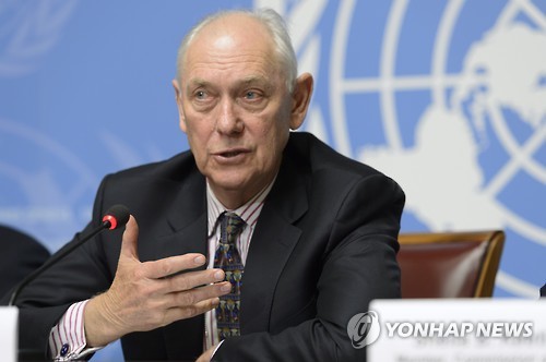 | △ (제네바=연합뉴스) 류현성 특파원 = 마이크 스미스 유엔 에리트레아 인권조사위원회 위원장이 24일(현지시간) 스위스 제네바 유럽 유엔본부에서 기자회견을 열어 에리트레아인들이 경제적 이유가 아니라 인도주의적 범죄에 가까운 폭정을 피해 매달 수천 명씩 고국에서 도망 나오고 있다면서 이들을 수용한 국가들은 이들을 본국으로 송환하지 말라고 촉구하고 있다. (AP=연합뉴스 사진자료) |