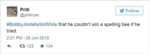 25일(현지시간) NBC 방송과 일간지 워싱턴포스트에 따르면, 인도에서는 진달 주지사의 공화당 대선 경선 참가 소식이 알려지고서 사회관계망서비스(SNS)인 트위터에서 '바비 진달은 아주 백인이다'(#bobbyjindalissowhite)라는 해시태그가 붙은 글이 봇물 터지듯 쏟아졌다.
