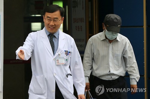 | △ 일상으로 돌아가는 메르스 환자 (대구=연합뉴스) 김준범 기자 = 26일 오전 중동호흡기증후군(메르스) 완치 판정을 받은 A(52)씨가 담당 의사인 김신우 감염내과 교수의 안내를 받으며 대구시 중구 삼덕동 경북대학교병원에서 퇴원하고 있다. |