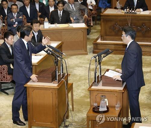 | △ (도쿄 교도=연합뉴스.자료사진) 아베 신조(安倍晋三) 일본 총리(왼쪽)와 제1야당인 민주당의 오카다 가쓰야(岡田克也) 대표가 지난 17일 국회에서 열린 당수 토론에서 설전을 벌이는 모습. |