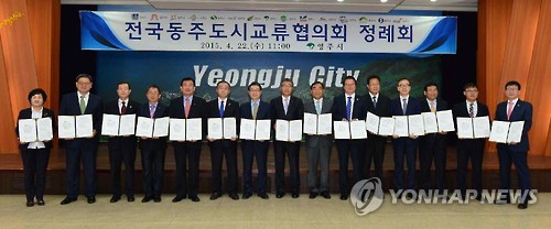 | △ '주(州)'자 돌림 지자체들 "옛 영광 되찾자" (충주=연합뉴스) 공병설 기자 = '주(州)'자 돌림 지방자치단체 15곳으로 구성된 전국동주도시교류협의회가 옛 영광을 되찾기 위해 올 하반기부터 본격적인 협력에 나선다. 지난 4월 열린 '상생발전을 위한 공동협정서' 체결식. 2015.6.28 <<충주시 제공>> kong@yna.co.kr |