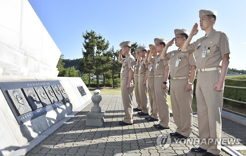 | △ 출전 결의식 (서울=연합뉴스) 제2연평해전 승전 13주년을 앞둔 27일 오전 제2연평해전 전사자 6인의 이름을 함명으로 명명한 윤영하함, 한상국함, 조천형함, 황도현함, 서후원함, 박동혁함의 함장들이 해상기동훈련을 위해 출항을 앞두고 제2연평해전 전적비를 찾아 전사자들의 부조 앞에서 경례하고 있다. 앞줄 22전투전대장 강동훈 대령. 뒷줄 오른쪽부터 윤영하함장 최창현 소령, 한상국함장 이창훈 소령 조천형함장 박태룡 소령, 황도현함장 박기범 소령, 서후원 함장 남상욱 소령, 박동혁 함장 송현준 소령. 2015.6.28 << 해군본부 >> photo@yna.co.kr |