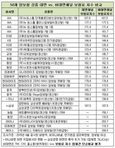 이번 조사 대상 가운데 40개 상품의 경우 대면-비대면 가입 채널 차이와 상관없이 보험료, 만기환급금, 보험료지수가 같았다.