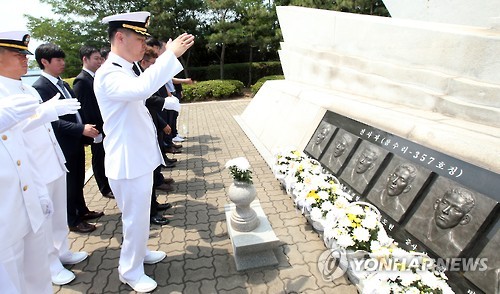 | △ "제2연평해전 영웅들이여" (평택=연합뉴스) 신영근 기자 = 제2연평해전 13주년인 29일 오전 경기도 평택 해군 제2함대 사령부에서 열린 기념식에 참석한 해전 당시 참수리 357호의 부정장이었던 이희완 소령 등 승조원들이 전사한 동료 장병에게 경례하고 있다. |