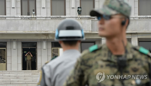 | △ 북한은 29일 남측의 체제통일 시도는 대결과 전쟁밖에 가져올 것이 없다고 비난하고 남북이 불신과 대결을 끝장내자면 체제통일 책동을 걷어치워야 한다고 주장했다. 자료사진은 판문점에서 우리 군 장병과 북한군 경비대가 각각 경계 근무를 서고 있는 모습. |