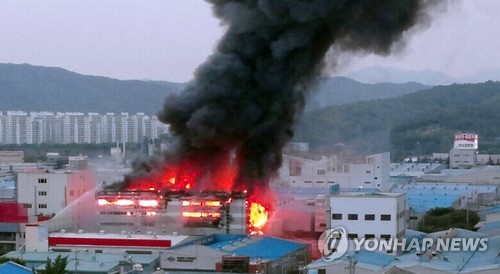 | △ 대구 검단공단에 불 (대구=연합뉴스) 김용민 기자 = 29일 오후 7시 10분께 대구시 북구 검단동 공단에서 불이 났다. 불이 나자 소방차 40여대가 출동, 진화 중이다. 2015.6.29 yongmin@yna.co.kr |