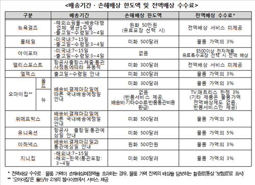 한국소비자원은 30일 소비자상담이 접수된 배송대행업체 10개사의 거래조건을 비교한 결과, 분실·파손에 대한 배상 범위가 다양한 것으로 확인됐다고 밝혔다.