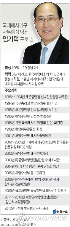 (런던=연합뉴스) 황정우 특파원 = 임기택(59) 부산항만공사 사장이 유엔 전문기구인 국제해사기구(IMO) 사무총장에 선출됐다.