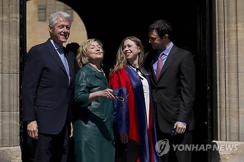 | △ 빌 클린턴 전 미국 대통령(왼쪽), 차기 미국 대통령 선거의 유력 주자인 힐러리 클린턴 전 미국 국무장관(왼쪽에서 두 번째)에 이어 부부의 딸인 첼시 클린턴(힐러리 옆)마저 고액 강연 논란에 휩싸였다. (AP=연합뉴스 DB) |