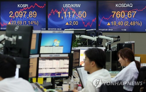 (서울=연합뉴스) 강종훈 기자 = 코스피가 1일 그리스 채무불이행(디폴트) 사태에도 1%대 강세를 보이며 2,100선에 바짝 다가섰다. 코스닥지수는 2%대 급등해 760선을 회복했다.