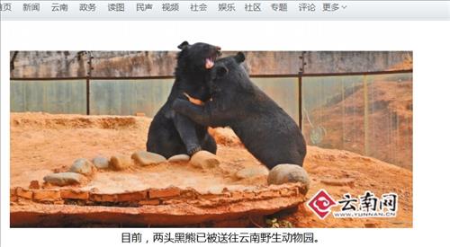 지난달 30일 두 마리 흑곰은 왕 씨의 품을 떠나 윈난성 야생동물보호구조센터로 옮겨졌다.