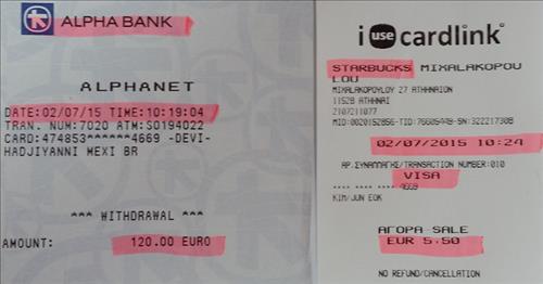 | △ 아테네에서 2일(현지시간) ATM에서 120유로를 인출한 영수증과 커피전문점에서 결제한 신용카드 영수증 |