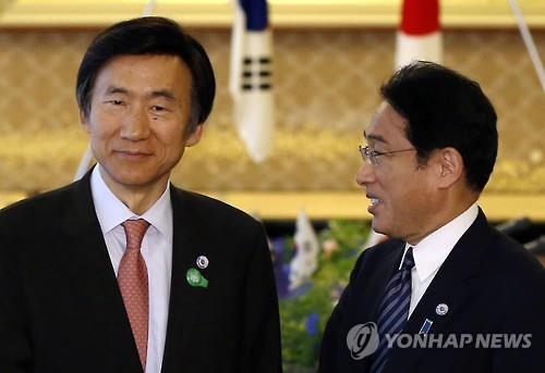 | △ 지난달 21일 도쿄에서 회담한 윤병세(왼쪽) 외교부 장관과 기시다 후미오 일본 외무상. |