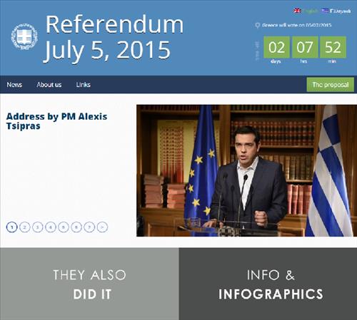 그리스 정부는 2일(현지시간) 알렉시스 치프라스 총리가 국민투표를 제안한 배경과 채권단의 제안에 반대해야 하는 이유 등을 소개한 공식 웹사이트를 개설했으며 야당 대표와 전 총리 등은 찬성을 촉구하는 성명을 냈다.