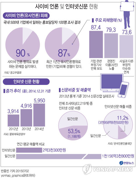(서울=연합뉴스) 김인철 기자 = 국내 대기업 약 10곳 중 9곳이 사이비 언론(유사언론) 행위로 인해 피해를 본 적이 있다는 조사 결과가 나오자 3일 인터넷과 사회관계망서비스(SNS)에서는 사이비 언론의 폐해가 심각한 만큼 즉각 퇴출시켜야 한다는 의견들이 많이 나왔다.