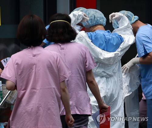 | △ 보호장구 착용하는 관계자들 (서울=연합뉴스) 박동주 기자 = 2일 오후 강남구 일원동 삼성서울병원에서 관계자들이 선별진료소 확장 공사 작업과 관련해 의료 기기 및 물품을 운반하기 위해 방호복 등 보호장구를 착용하고 있다. 중앙메르스관리대책본부는 이날 삼성서울병원의 자체 중동호흡기증후군(메르스) 검사에서 간호사 1명이 1차 양성이 나와 확진을 위해 국립보건연구원에서 2차 검사를 진행할 예정이라고 밝혔다. pdj6635@yna.co.kr |