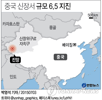 (베이징=연합뉴스) 이준삼 특파원 = 3일 오전 9시 7분(현지시간)께 위구르족 거주지인 중국 신장(新疆)위구르 자치구에서 규모 6.5의 지진이 발생했다고 중국언론들이 보도했다.