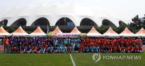 | △ 부·울·경 광역의회 운동회 (부산=연합뉴스) 김재홍 기자 = 3일 부산시 동래구 사직동 아시아드 보조경기장에서 부산·울산·경남 광역의회 의원들의 '동남권 상생 발전을 위한 친선 운동회'가 열렸다. 2015.7.3 pitbull@yna.co.kr |