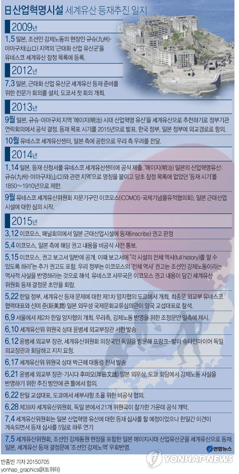 일본 정부는 5일 독일 본 월드컨퍼런스센터에서 열린 제39차 유네스코 세계유산위원회 회의에서 자국이 등재 신청한 메이지시대 산업유산이 세계유산으로 등재되자 이에 대한 감사를 겸한 발언(statement)을 통해 이같이 언급했다.
