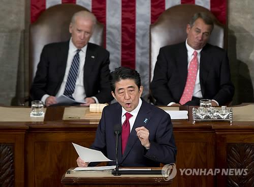 | △ 지난 4월말 미국 의회에서 연설하는 아베 총리. 아베 총리는 당시 식민지배와 침략에 대한 사죄를 거론하지 않았다. (AP.연합뉴스.자료사진) |