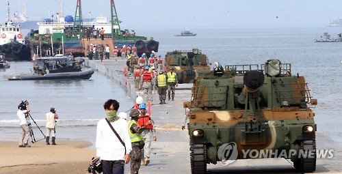 | △ 한미 연합 해안 양륙 군수지원 훈련 (대전=연합뉴스) 양영석 기자 = 9일 충남 태안 해안가에서 열린 한미 연합 합동 해안양륙군수지원 훈련에 참가한 K55 자주포가 부유식 부두를 따라 해안가에 상륙하고 있다. 2015.7.6 youngs@yna.co.kr |