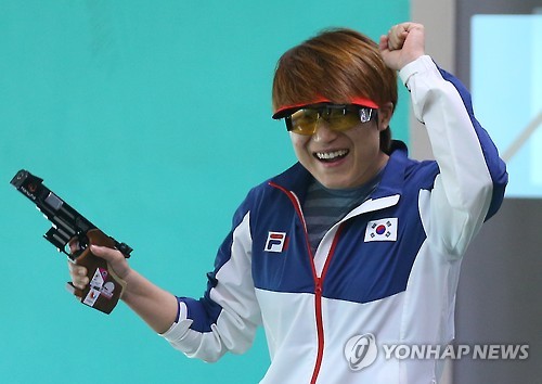 | △ 김지혜, 25m 권총 개인전 금메달…U대회 2관왕 (나주=연합뉴스) 김도훈 기자 = 6일 오전 전남 나주시 나주전남종합사격장에서 열린 2015 광주하계유니버시아드 여자 25m 권총 결승에서 김지혜가 금메달을 확정지은 뒤 기뻐하고 있다. 김지혜는 이날 오전 열린 단체전에서 금메달을 따 대회 2관왕을 기록했다. |