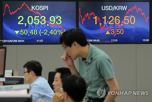 | △ 코스피 3년만에 최대 하락 (서울=연합뉴스) 이정훈 기자 = 그리스 국민투표에서 채권단의 긴축안에 대해 압도적인 반대표가 나오면서 향후 사태 전개가 안갯속에 빠져들자 국내 증시가 6일 폭락세를 보였다. 이날 코스피 하락률은 2012년 6월 4일(51.38포인트, 2.80% 하락) 이후 가장 컸다. 코스피는 전 거래일보다 50.48포인트(2.40%) 내린 2,053.93, 원/달러 환율은 전 거래일보다 3.5원 오른 1,126.5원에 거래를 마쳤다. 사진은 이날 서울 중구 명동 외환은행 본점 딜링룸. |