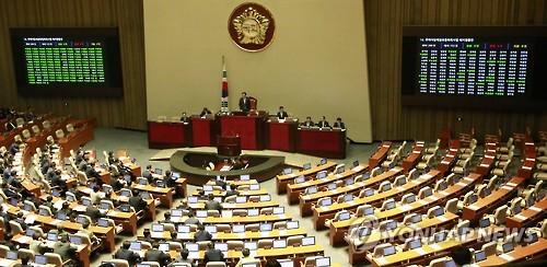| △ (서울=연합뉴스) 이상학 기자 = 새누리당 의원들이 6일 오후 속개된 국회 본회의에서 민생법안을 단독 처리하고 있다. 새정치민주연합은 국회법 개정안 재의결이 새누리당의 '표결불참'으로 무산된데 반발, 당초 이날 본회의에서 의결키로 했던 61개 법안 처리에 협조하지 않기로 했다. 2015.7.6 leesh@yna.co.kr |