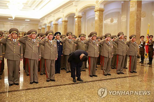 김정은 제1위원장도 이날 자정 황병서 군 총정치국장, 박영식 대장, 리영길 군 총참모장, 김원홍 국가안전보위부장 등 군 고위간부들을 대동하고 할아버지 김 주석과 아버지 김정일 국방위원장의 시신이 안치된 금수산태양궁전을 참배했다.