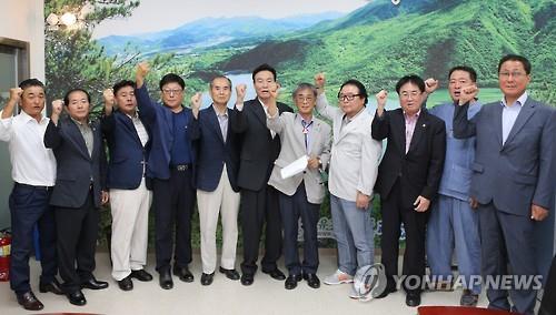 | △ (괴산=연합뉴스) 변우열 기자 = 문장대 온천개발 저지 충북 괴산군 대책위원회는 지난 7일 오전 괴산군청 브리핑실에서 기자회견을 열고 경북 상주의 문장대 온천개발의 중단을 요구했다. 2015.7.7 bwy@yna.co.kr |