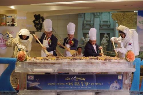 정승인 세븐일레븐 대표와 계상혁 세븐일레븐 경영주협의회장 등이 직접 대형 주걱을 휘저어 711인분짜리 팥빙수를 만들었다.