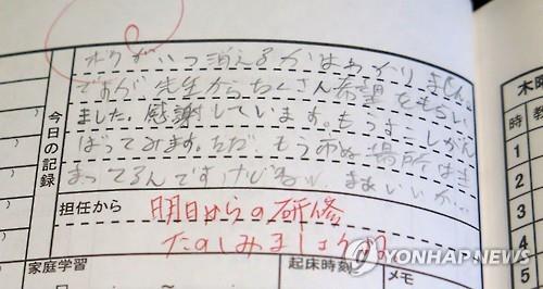 | △ (이와테 교도=연합뉴스) 집단 괴롭힘에 시달리다 자살한 것으로 추정되는 중학생 마쓰무라 료 군이 담임교사에게 하루를 돌아보는 내용을 적어 제출하는 노트에 '이미 죽을('市ぬ'는 '死ぬ'의 오기로 추정됨) 장소는 정해져 있다'는 내용이 기재돼 있다. 담임교사는 '내일부터 (예정된) 연수를 즐기자' 붉은 글씨로 답변했다. 2015.7.9 sewonlee@yna.co.kr (끝) |