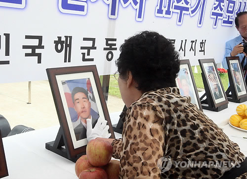 | △ 지난 2013년 6월 국립대전현충원에서 열린 제2연평해전 전사자 11기 추모식에서 고(故) 한상국 중사의 어머니가 아들의 영정 사진을 쓰다듬고 있다. (연합뉴스 자료사진) |