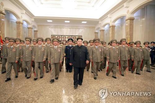 | △ 北 김정은, 김일성 21주기 맞아 금수산태양궁전 참배. (조선중앙통신=연합뉴스 자료사진) |