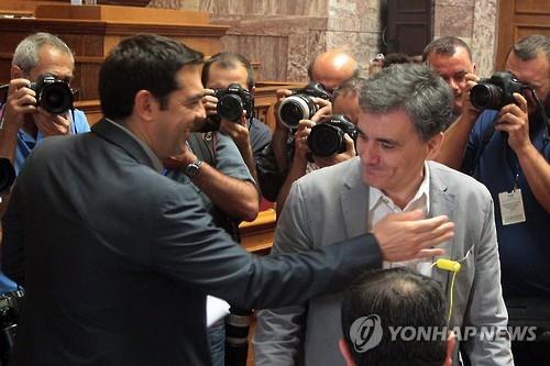 | △ 10일 그리스 의회에서 치프라스 총리(왼쪽)가 차칼로토스 재무장관을 맞이하고 있다.(EPA=연합뉴스) |
