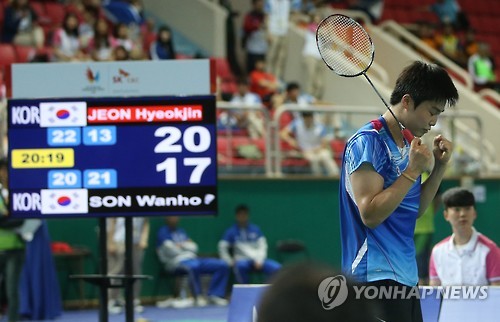 | △ <U대회> 전혁진, 손완호 꺾고 금메달! (화순=연합뉴스) 김주성 기자 = 12일 오후 전남 화순하니움문화스포츠센터에서 열린 2015 광주하계유니버시아드대회 배드민턴 남자 단식 결승 한국의 손완호 대 전혁진 경기. 전혁진이 손완호를 세트 스코어 2대1로 꺾고 금메달을 확정지은 뒤 주먹을 불끈 쥐고 있다. 2015.7.12 utzza@yna.co.kr |