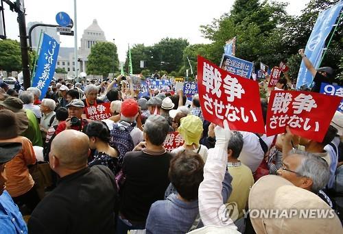 | △ 2015년 6월 14일 일본 국회 근처에서 집단자위권 행사를 허용하도록 안보법제를 정비하는 것에 반대하는 시위가 열리고 있다.(AP=연합뉴스) |