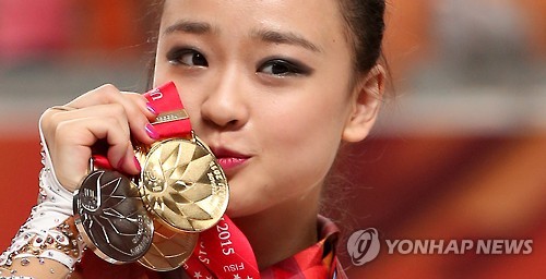 (광주=연합뉴스) 특별취재단 = '리듬체조 요정' 손연재(21·연세대)가 2015 광주 하계유니버시아드 종목별 결승 첫 두 종목인 후프와 볼에서 연거푸 금메달을 획득하고 3관왕에 올랐다.