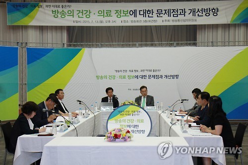 | △ 방송의 건강의료정보 토론회 (서울=연합뉴스) 방송통신심의위원회가 13일 오후 서울 목동 방송회관에서 열린 '방송의 건강의료정보에 대한 문제점과 개선방향 토론회'에서 건강·의료 프로그램의 폭발적인 증가와 이에 따른 왜곡된 정보 전달 및 무분별한 광고 개선 방안을 논의하고 있다. 2015.7.13 << 방송통신심의위원회 제공 >> dohh@yna.co.kr |