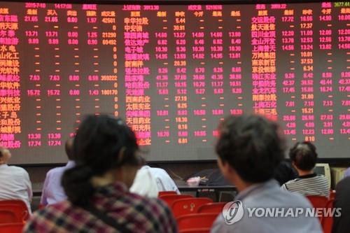 | △ (상하이=연합뉴스) 정주호 특파원 = 중국 증시가 이틀째 급등한 10일 중국 상하이 푸둥의 한 증권사 객장에서 투자자들이 붉은색 상한가 종목으로 덮여있는 시세 전광판을 지켜보고 있다. 이날 상하이종합지수는 4.54% 급등했다. 2015.7.10 |