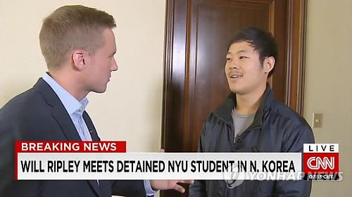 | △ (서울=연합뉴스) 북한이 불법입국 혐의로 체포해 억류한 미국 한인 대학생 주원문(21) 씨가 지난 5월 미국 CNN방송과 인터뷰하는 모습.<<연합뉴스 자료사진>> |