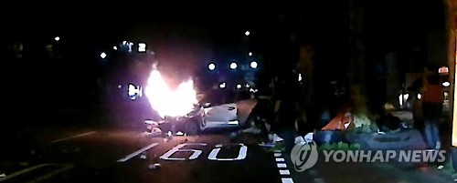 (대구=연합뉴스) 김선형 기자 = 교통사고로 불이 붙은 승용차에 갇힌 부상자들을 시민들이 구조했으나 안타깝게 2명이 숨졌다.